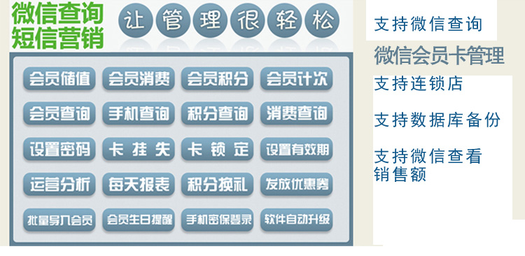 軟件可以儲值、積分、打折、計次、計時、會員管理、商品管理、商品進銷存、生日提醒、發(fā)送信息等等功能。