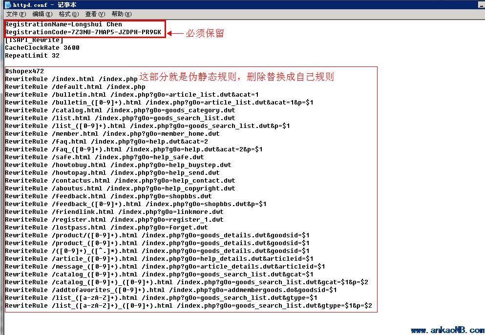 2、開(kāi)啟以后,用記事本打開(kāi)編輯修改網(wǎng)站目錄others里面的httpd.conf,這里以站點(diǎn)名為ankaonb舉例,文件路徑就是D:\wwwroot\ankaonb\others,注意httpd.conf里面頂部?jī)尚胁荒芴鎿Q,規(guī)則替換為自己的即可。
