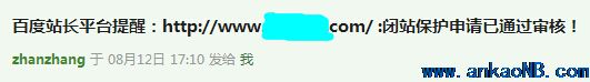 2014年8月11日接到空間商通知,因為網(wǎng)站備案號被注銷,網(wǎng)站被關閉。晴天霹靂!想了很久才反應過來,一年前搞了快速備案,換空間的時候一直沒有改接入,所以才被注銷了。為了能快速打開網(wǎng)站,我只好再次找快速備案的渠道。正好又遇到周末,預估備案下來要5天左右,這時只能選擇百度的閉站保護,否則肯定會被降權的。