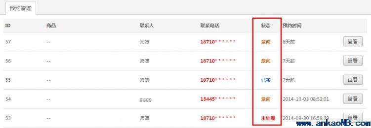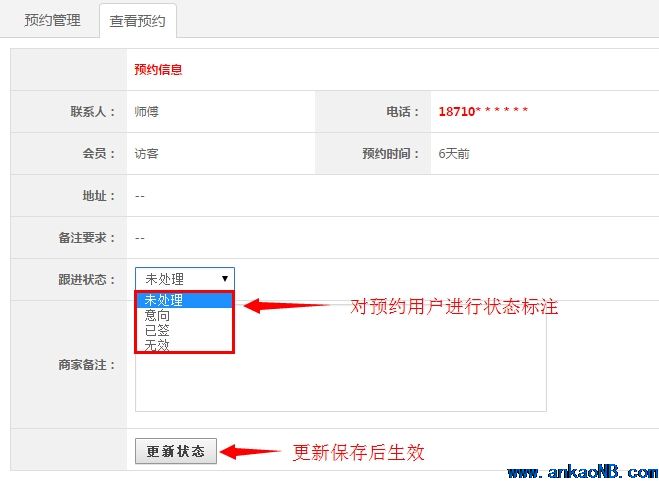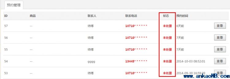 2、商家或者酒店在用戶(hù)中心查看預(yù)約用戶(hù)信息(默認(rèn)狀態(tài)下,全部顯示為未處理狀態(tài)),并且進(jìn)行電話(huà)或者QQ跟蹤了解用戶(hù);