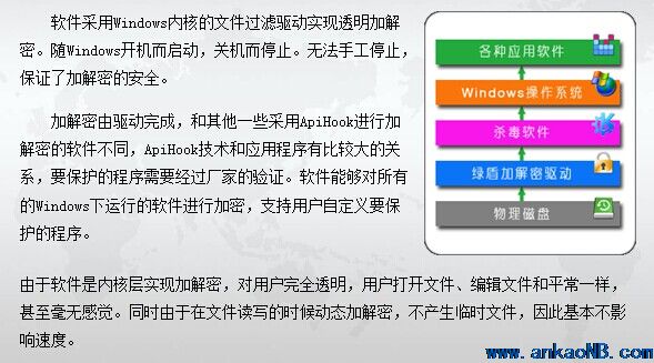 安靠加密軟件采用Windows內(nèi)核的文件過濾驅(qū)動(dòng)實(shí)現(xiàn)透明加解密。隨Windows開機(jī)而啟動(dòng),關(guān)機(jī)而停止。無法手工停止,保證了加解密的安全。