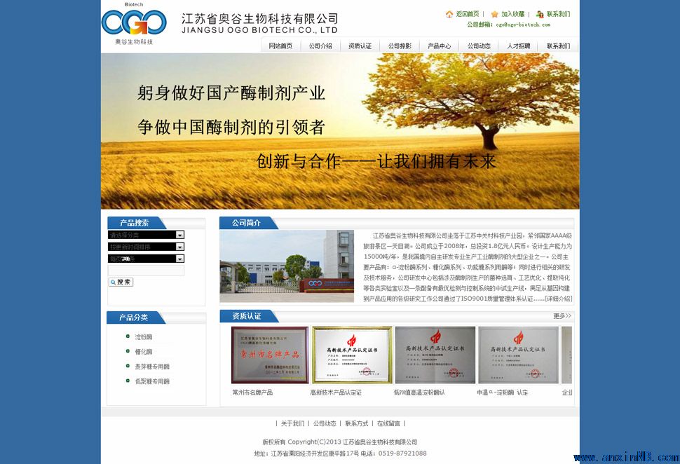 江蘇省奧谷生物科技有限公司坐落于江蘇中關村科技產(chǎn)業(yè)園,緊鄰國家AAAA級旅游景區(qū)—天目湖。公司成立于2008年,總投資1.8億元人民幣。設計生產(chǎn)能力為15000噸/年,是我國境內(nèi)自主研發(fā)專業(yè)生產(chǎn)工業(yè)酶制劑的大型企業(yè)之一。