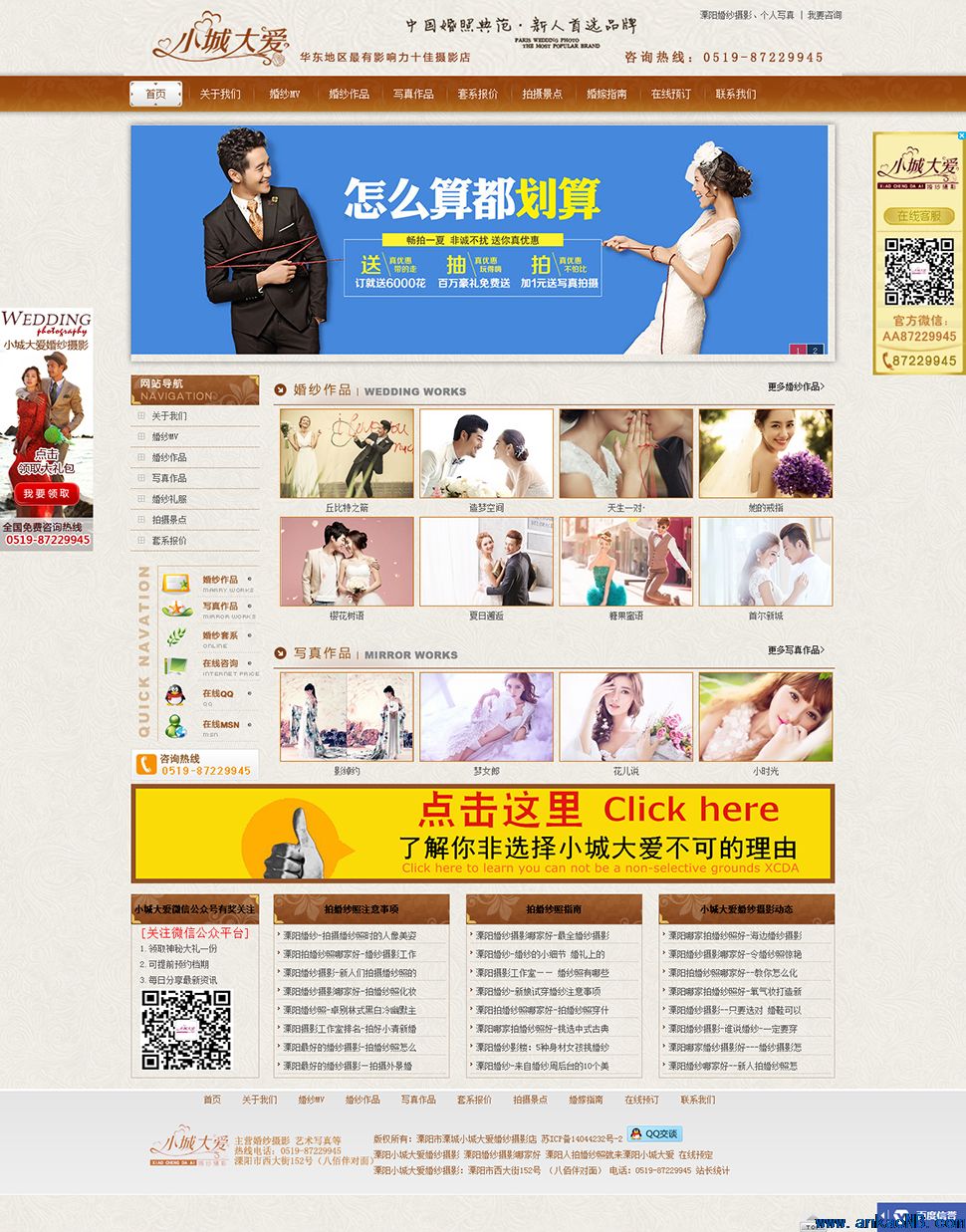 溧陽(yáng)市溧城小城大愛(ài)婚紗攝影店,創(chuàng)于2005年,致力于為80后、90后新人提供個(gè)性化的婚紗攝影服務(wù)。自成立以來(lái),小城大愛(ài)以其時(shí)尚、清新、浪漫、唯美的風(fēng)格吸引了眾多消費(fèi)群體,并見(jiàn)證了無(wú)數(shù)對(duì)準(zhǔn)新人的完美愛(ài)情。溧陽(yáng)市小城大愛(ài)婚紗攝影店8年行業(yè)品質(zhì)保證,延續(xù)著溧陽(yáng)婚紗攝影集團(tuán)17年管理經(jīng)驗(yàn),作為溧陽(yáng)地區(qū)唯一一家獲得"華東地區(qū)攝影十大優(yōu)秀企業(yè)"殊榮的公司,在不斷樹(shù)立行業(yè)標(biāo)桿的同時(shí),繼續(xù)引領(lǐng)婚紗攝影行業(yè)的創(chuàng)新風(fēng)潮。