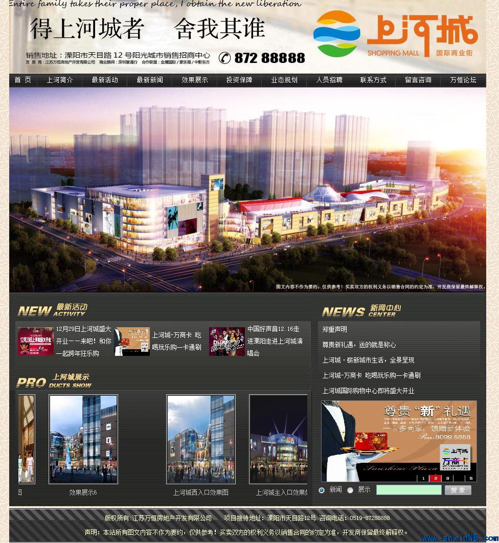 陽光城市·上河城18萬平米國際shopping mall 靠近百萬平米陽光城市精英居住區(qū),位于平陵中路與天目湖交叉口,直接面臨平陵中路、天目路、溪路三條城市主干道,西靠市政公園清溪河景觀帶,是一座集娛樂、休閑、時尚百貨,大型超市、步行街于一體的國際化現(xiàn)代商業(yè)中心。 http://www.shangheplaza.com